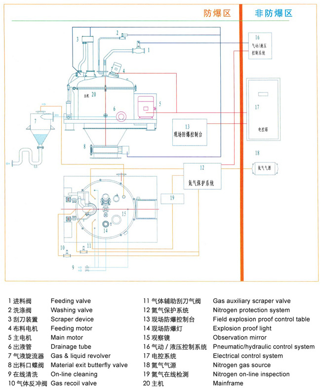 7、安全保護裝置:過振動保護、過流保護、溫控保護、料層控制、刮刀行程保護、開蓋保護等機械和電氣聯鎖保護裝置,確保機械安全使用。